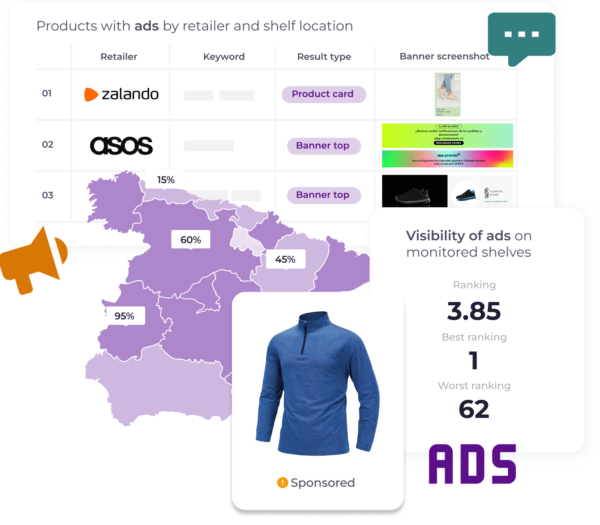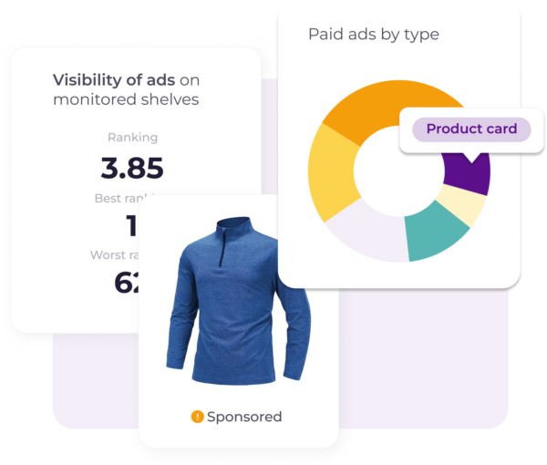 Your e-commerce teams will be able to monitor sponsored products, branded banners and video ads on marketplaces such as Amazon or Walmart, with SEM and PPC dynamics.