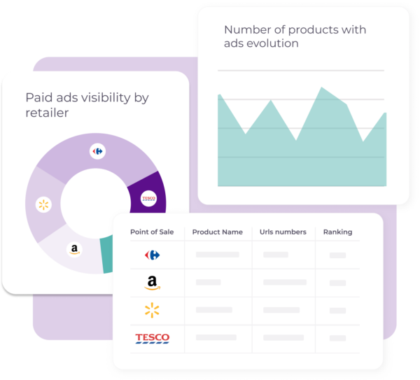 Your e-commerce teams will be able to monitor sponsored products, branded banners and video ads on marketplaces such as Amazon or Walmart, with SEM and PPC dynamics.